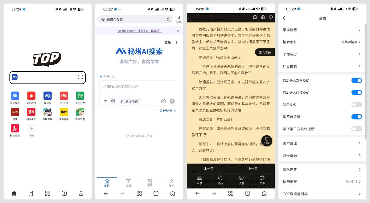 Top浏览器为用户提供纯净浏览体验,没有任何广告、推送或新闻干扰。它拥有原创的订阅功能,让用户方便地追小说、影视和漫画。此浏览器支持JS脚本功能,并完全兼容油猴脚本,使得浏览器的功能更加丰富和强大。用户反馈表明,这款浏览器不仅界面简洁,而且通过其强大的脚本支持功能,极大地提升了用户的浏览体验。