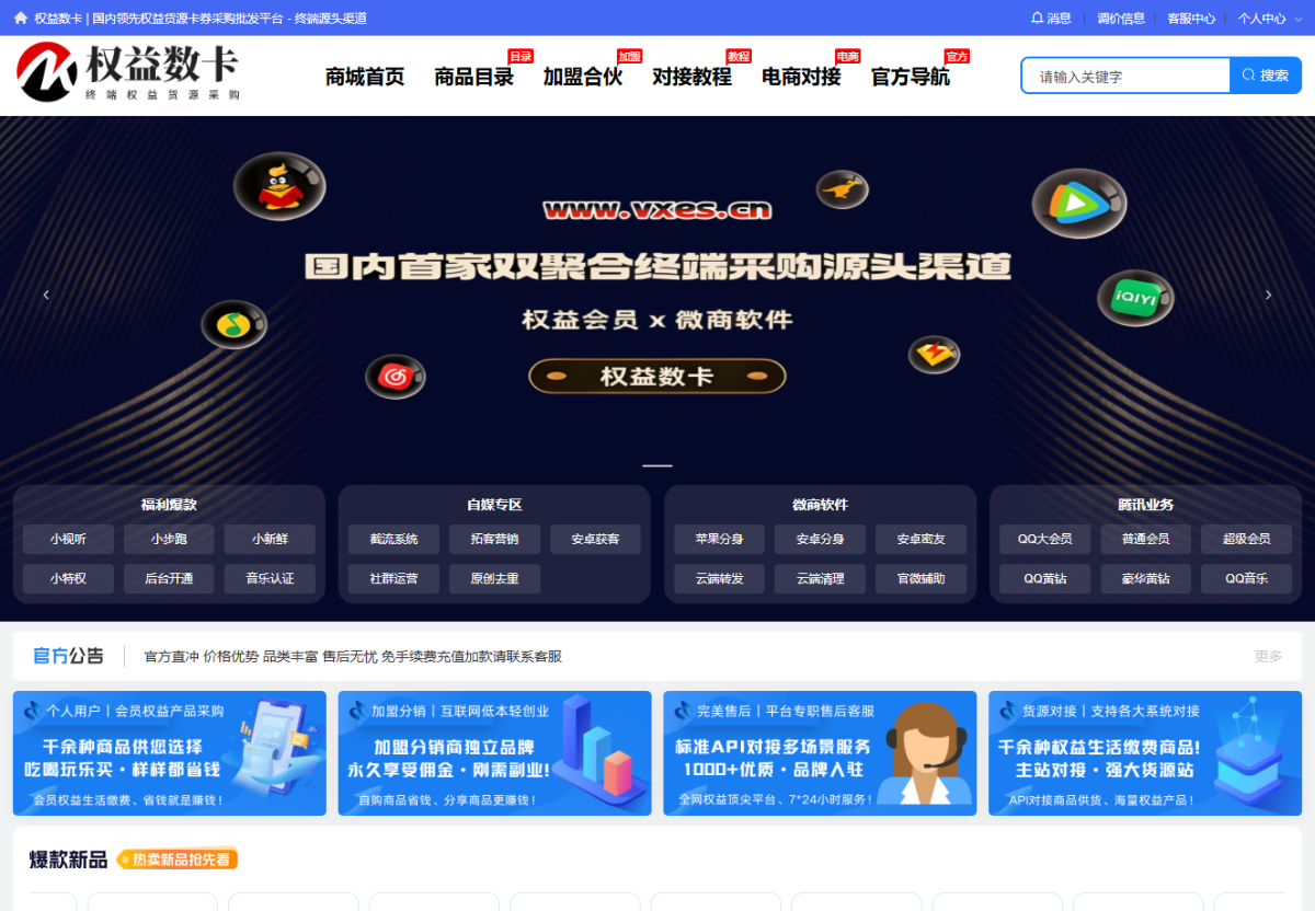权益数卡是一个经过行业认证的大型权益充值平台,拥有最齐全的优势一手货源渠道。其业务范围广泛,涵盖影视会员、音乐影音、库迪代下、瑞幸代下、文娱会员、游戏点卡点券、生活服务、权益卡密批发、话费电费充值等热销核心爆款类目产品。