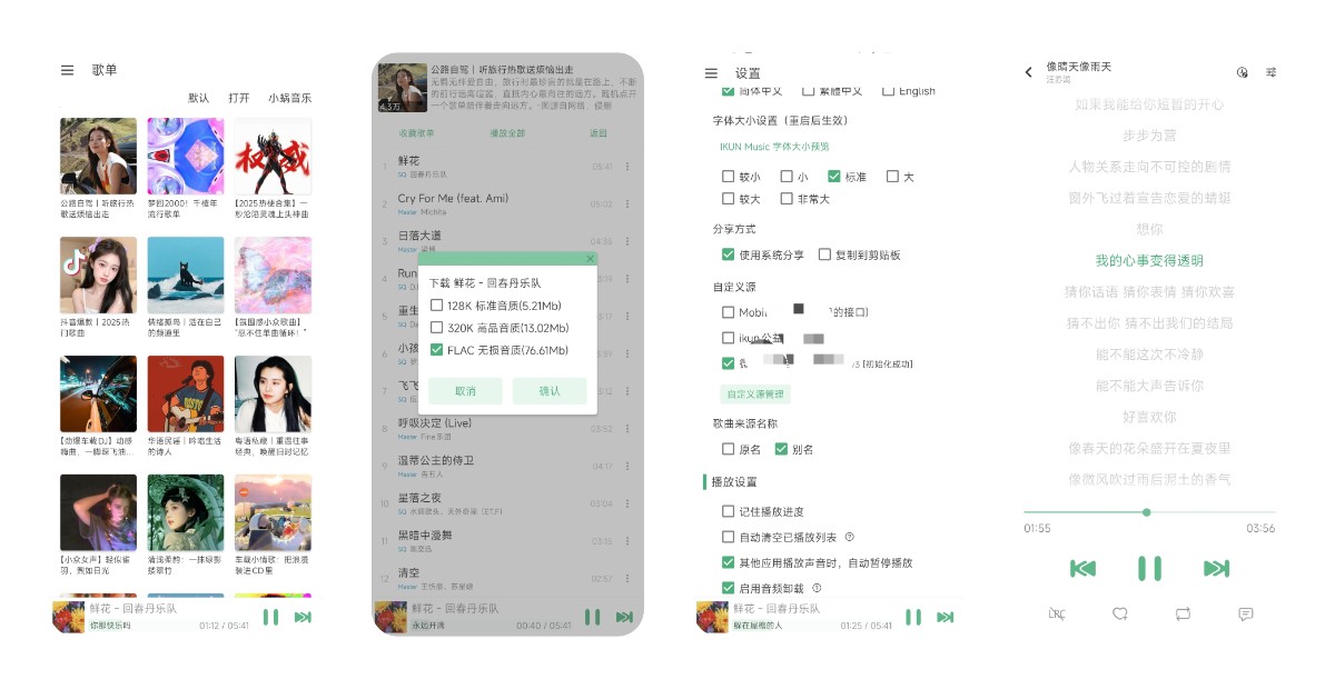 ikun music是一款多功能音乐软件,它集成了多个平台的音乐资源,用户可以轻松搜索并播放海量歌曲。该应用不仅支持在线播放,还允许用户下载喜爱的音乐以便离线收听,并且提供了歌词显示功能,使您在欣赏音乐的同时能够跟随歌词一起唱。