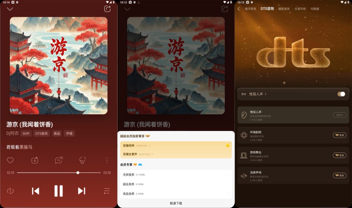 畅听所有付费/版权受限歌曲(含周杰伦、林俊杰等独家曲库); 支持无损音质(FLAC/APE)与至臻音质在线播放与下载; MV视频可直接下载,且文件未加密,可自由转移或备份; 解锁全部动态播放界面、3D音效、环绕声、均衡器预设; 可使用全部主题皮肤与桌面挂件(在设置中自由更换)。