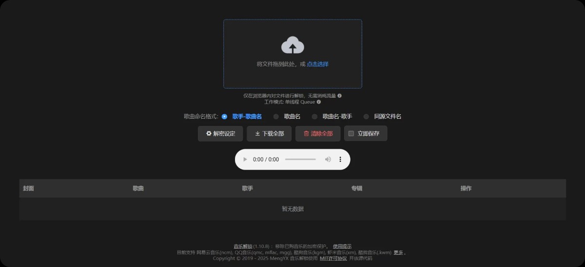Unlock Music 离线版 v0.2.19 为你彻底打破这道壁垒!这是一款完全离线、无需网络、开源免费的音乐解密工具,支持QQ音乐、网易云音乐、酷狗、虾米、咪咕、喜马拉雅、JOOX 等主流平台全部加密格式,一键将加密文件还原为标准 MP3、FLAC、OGG 等通用音频格式,让你真正“拥有”自己的音乐收藏。