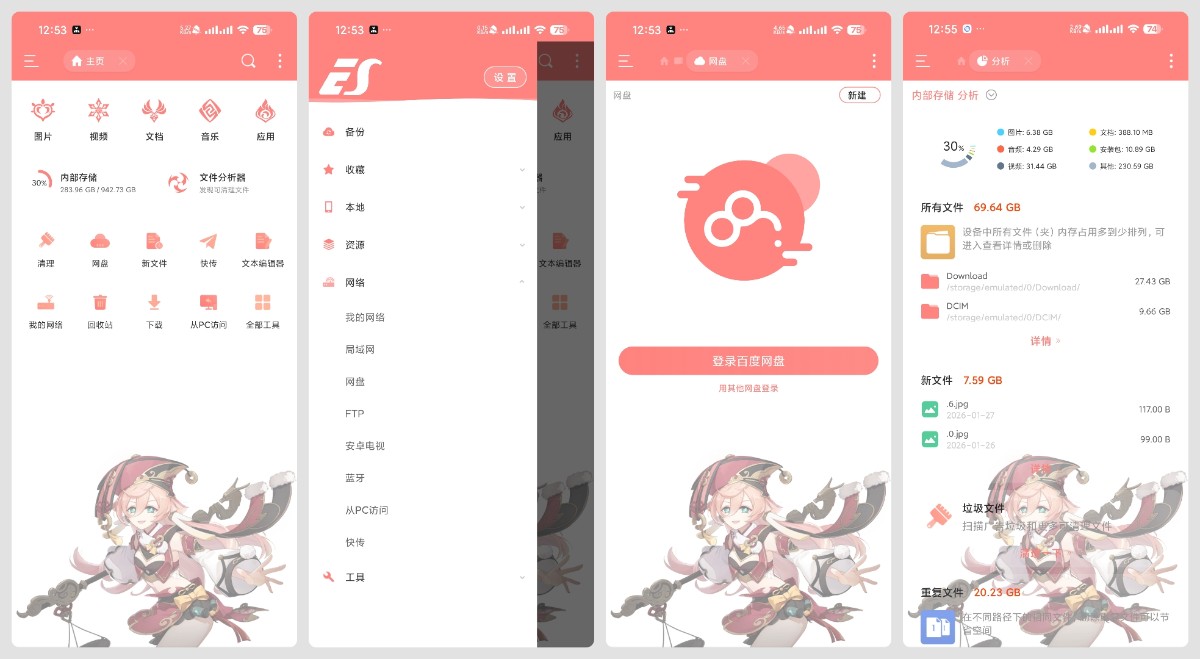 一款原生中文支持,全球上亿用户一致选择的最强安卓文件管理器。点击就可以播放音乐、视频,查看图片、文档,安装应用,查看压缩包,进行搜索以及更改视图。此版本是烟绯美化版,并解锁了永久会员,还有海量的网盘空间可以存放数据。