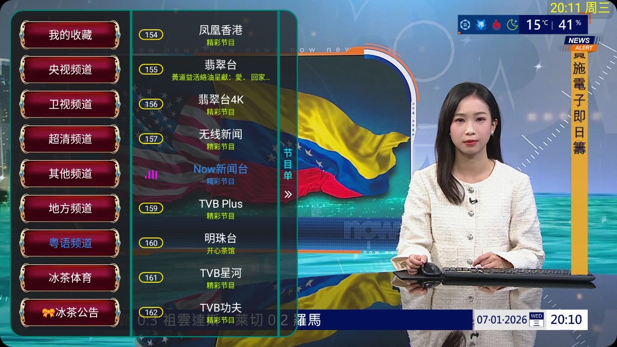 启动后即进入频道列表界面,节目单已加宽显示,便于遥控器精准选台。内容涵盖新闻、综艺、体育、影视、戏曲等主流类型,4K频道独立分类,画质清晰度取决于源信号本身。