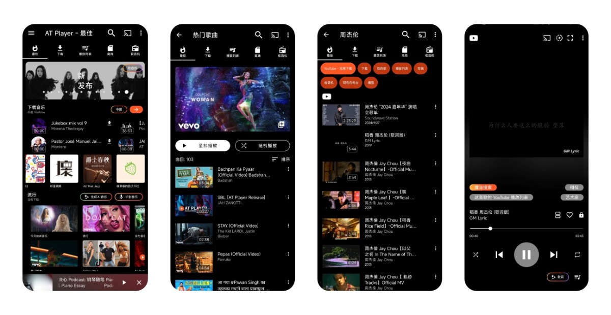 AT Player是一款功能丰富的音乐播放器和下载器,它允许用户无限下载和流式传输免费音乐和电影。通过此应用,你可以轻松地从Podcasts、Dropbox和Jamendo下载音乐以供离线收听,并且可以流式传输YouTube音乐(但不能下载)。其特色包括一个完全可配置的浮动弹出播放器,适用于多任务处理,以及播放器锁定模式和省电模式,帮助你在使用其他应用程序时节省电量并持续享受音乐。此外,它还提供了一个智能下载引擎,让你能够快速下载所有流派的MP3音乐。