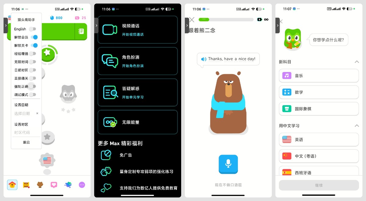 此外,还设有中文普通话学粤语的方言课程,助力学习者在粤语区顺畅交流。此国内版内置猫头鹰多功能助手,包括解锁关卡、无限时间、经验增强、强制正确、直接通关等功能。左上角点一下可以看到猫头鹰模块,模块包含:解锁关卡、无限时间、经验增强、强制正确、直接通关等功能,按需打开。
