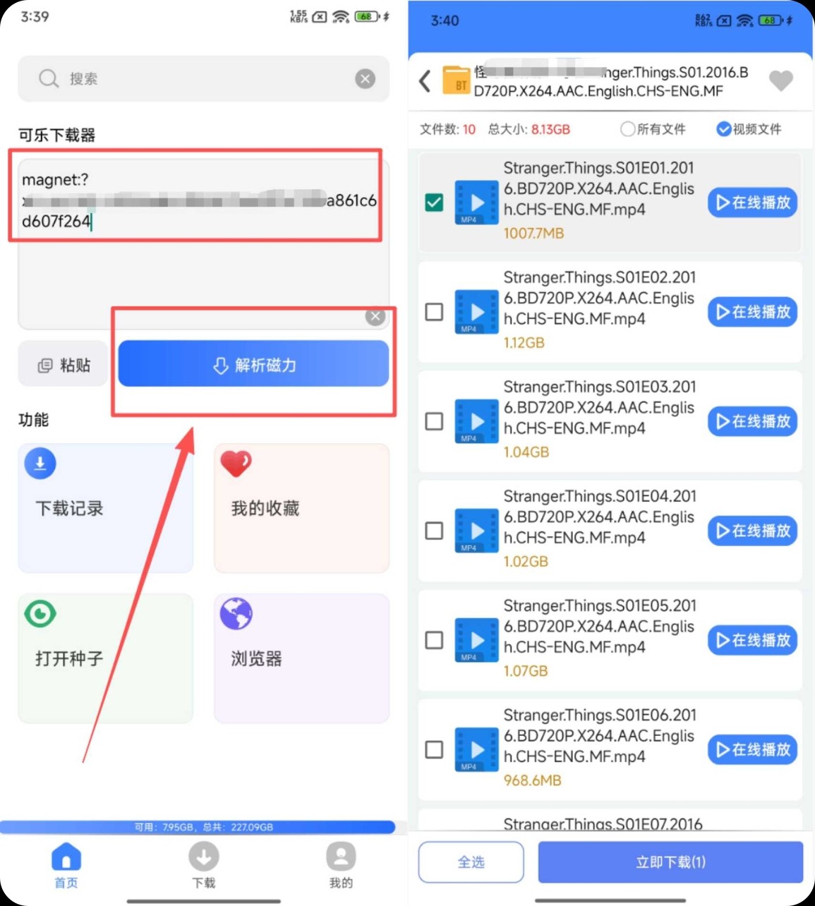 软件的使用方法简单到离谱,三步就能上手:复制好磁力链接,打开软件粘贴到输入框,点击【解析磁力】按钮,稍等片刻就能完成解析,全程丝滑无卡顿。给大家实测了一波《怪奇物语》第一季的磁力资源,解析后直接显示文件数、总大小,所有视频文件都能单独查看,每一集的大小、格式都标注得明明白白,精准找到自己想要的资源。