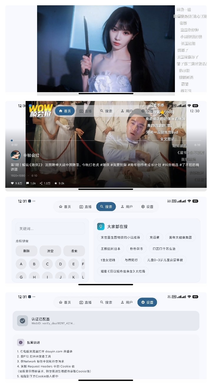 myDV TV版是借助AI技术开发的抖音第三方客户端,专为电视遥控器操作设计的大屏版抖音。该应用具备刷视频、观看关注的直播以及搜索这三大功能,用户仅需通过简单的遥控器操作,就能在电视大屏上畅享刷抖音的乐趣。比如通过上下键浏览视频,在首页按确定键可显示或隐藏视频详情,长按菜单键能弹出如弹幕开关、分辨率切换、倍速播放和查看主页等选项,左右键可调整视频进度,返回键能回到导航栏。需留意,因抖音未开放公开API,用户登录时需填写从抖音网页端获取的Cookie才能完成登录操作。登录需要配置cookie:在浏览器登录网页版抖音,按“F12”打开开发者选项,点开网络选项卡,刷新网页,点开随便一个请求,找到cookies复制。