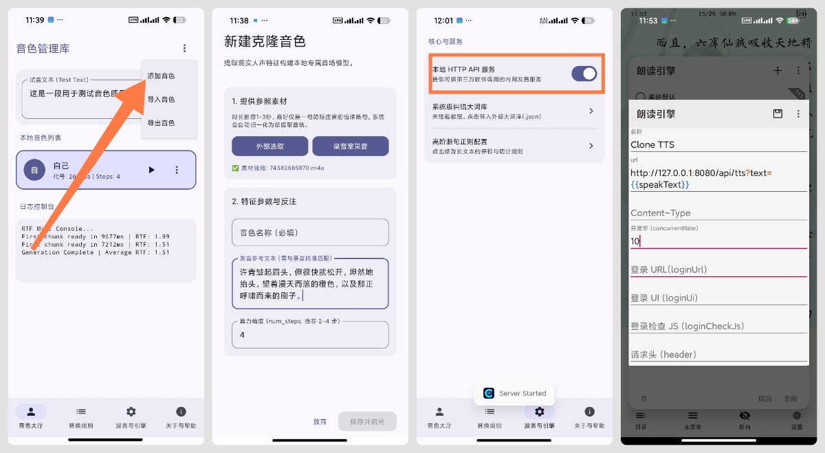 CloneTTS是一款运行在安卓系统本地的文字转语音(TTS)原生引擎,能让用户离线克隆所需声音,并运用该声音朗读书籍或长文本。使用步骤如下: