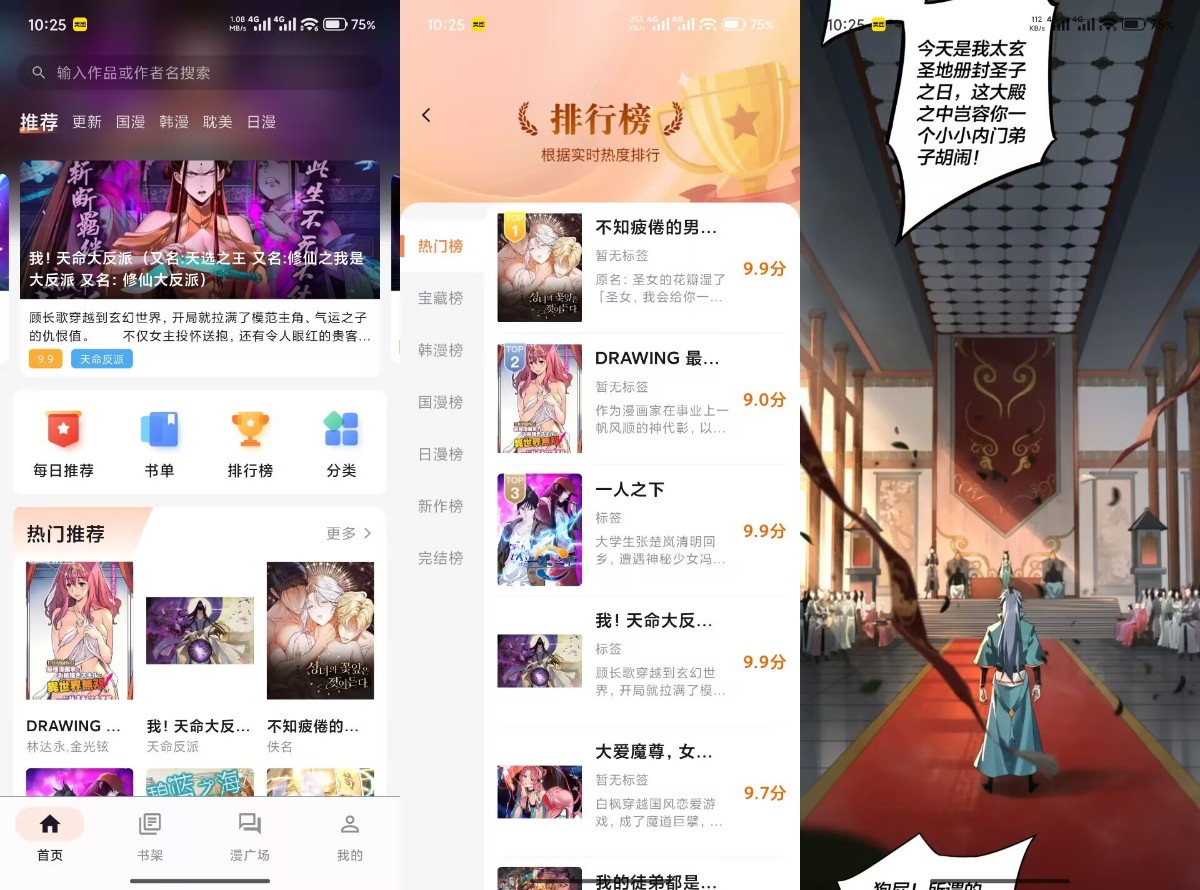 【使用说明】:一款免费无广的漫画阅读神器,提供了国漫、韩漫、日漫等资源,还可以查看排行榜,喜欢的都可以加入书架,或者直接下载到本 地随时阅读,无需登录也可以直接看