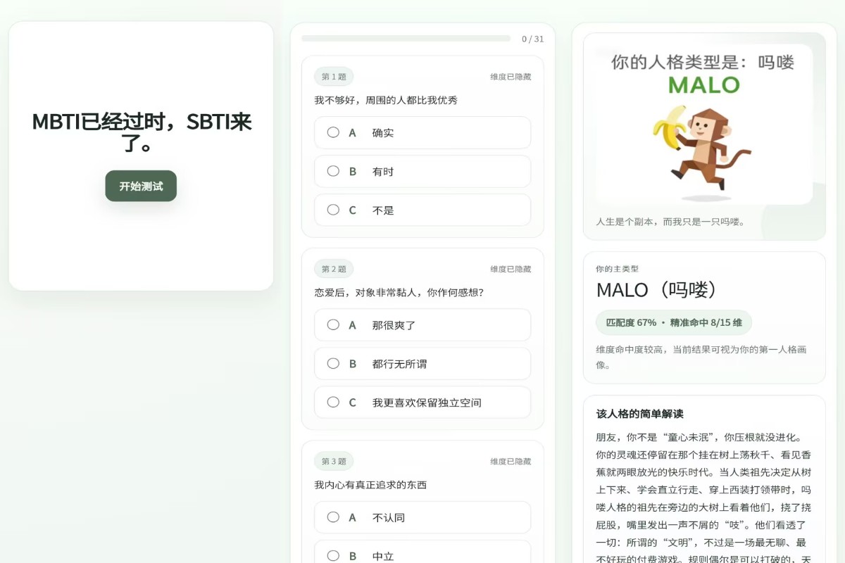 【软件名称】:SBTI测试【软件版本】:1.01【软件大小】:6.25M【测试系统】:小米【使用说明】:一款手机职业/性格测试App,认识自我,洞察潜力!基于MBTI(迈尔斯-布里格斯类型指标)等科学理论,提供专业、详细的性格类型评估。通过一系列精心设计的问卷,帮助你深入了解自己的性格特质、优势劣势、沟通方式、职业倾向等,为个人成长和职业规划提供有价值的参考。(解锁VIP功能)【下载地址】: